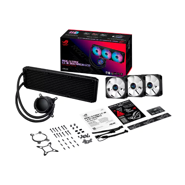 سه فن 120 میلی‌متری به‌کاررفته در خنک‌کننده آبی ایسوس ROG Strix LC III 360 ARGB LCD هستند که به لطف طراحی خاص پره‌ها و قابلیت کنترل از طریق PWM/DC، هم خنک‌کنندگی قوی و هم صدای بسیار کمی دارند.