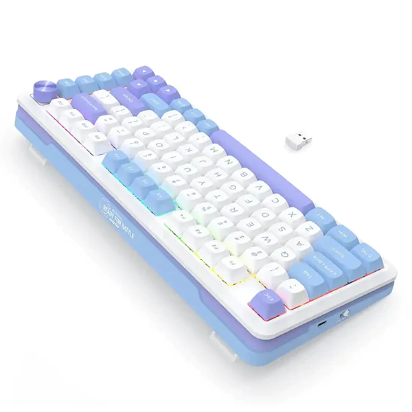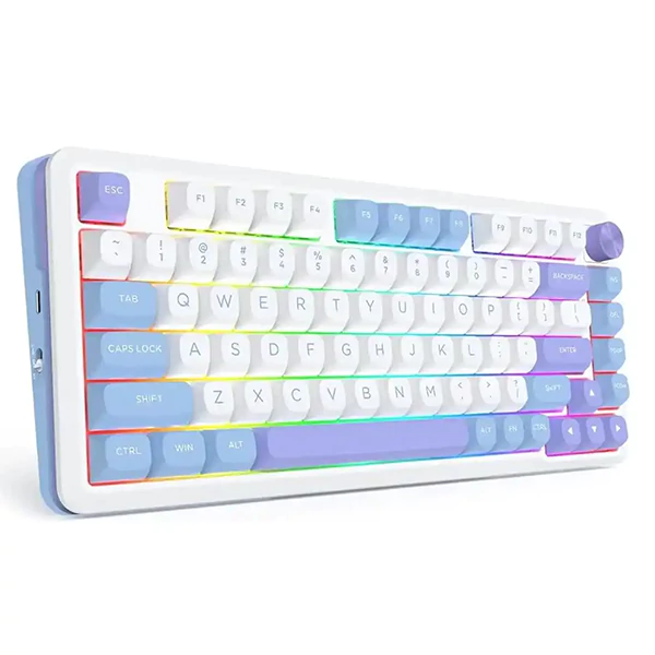این کیبورد دارای ۸۱ کلید است که با حذف بخش نامپد (Numpad) و برخی کلیدهای اضافی، ابعاد آن جمعوجور شده است. این ویژگی به موس شما اجازه میدهد فضای آزاد بیشتری برای حرکت داشته باشد که در بازیهای شوتر اول شخص (FPS) امری حیاتی است. رنگبندی سفید – آبی – بنفش این کیبورد، حس تکنولوژی پیشرفته و مدرن را به محیط کار یا بازی شما تزریق میکند و با سایر تجهیزات گیمینگ RGB شما هماهنگی فوقالعادهای دارد.