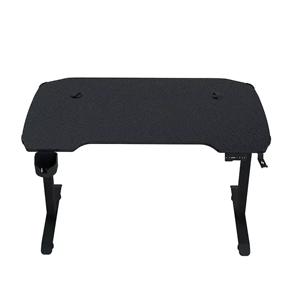 سطح میز، طراحی مدرن و مینیمال دارد و با رنگ مشکی و بافت فیبر کربن، جلوهای کاملاً گیمینگ و حرفهای به اتاق شما میدهد؛ مخصوصاً وقتی نورپردازی RGB را روشن میکنید.
