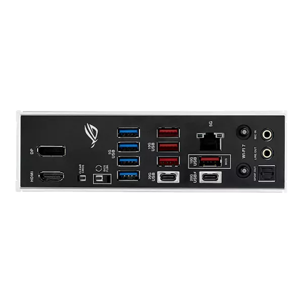 پورتهای پشت (Rear I/O) | 2× USB-C 20Gbps (یکی با PD Fast-Charge تا 30W) + 4× USB-A 10Gbps + 4× USB-A 5Gbps؛ DisplayPort، HDMI، RJ-45 5GbE، ماژول Wi-Fi، 2× جک طلایی صدا، 1× S/PDIF اپتیکال، BIOS FlashBack، Clear CMOS |